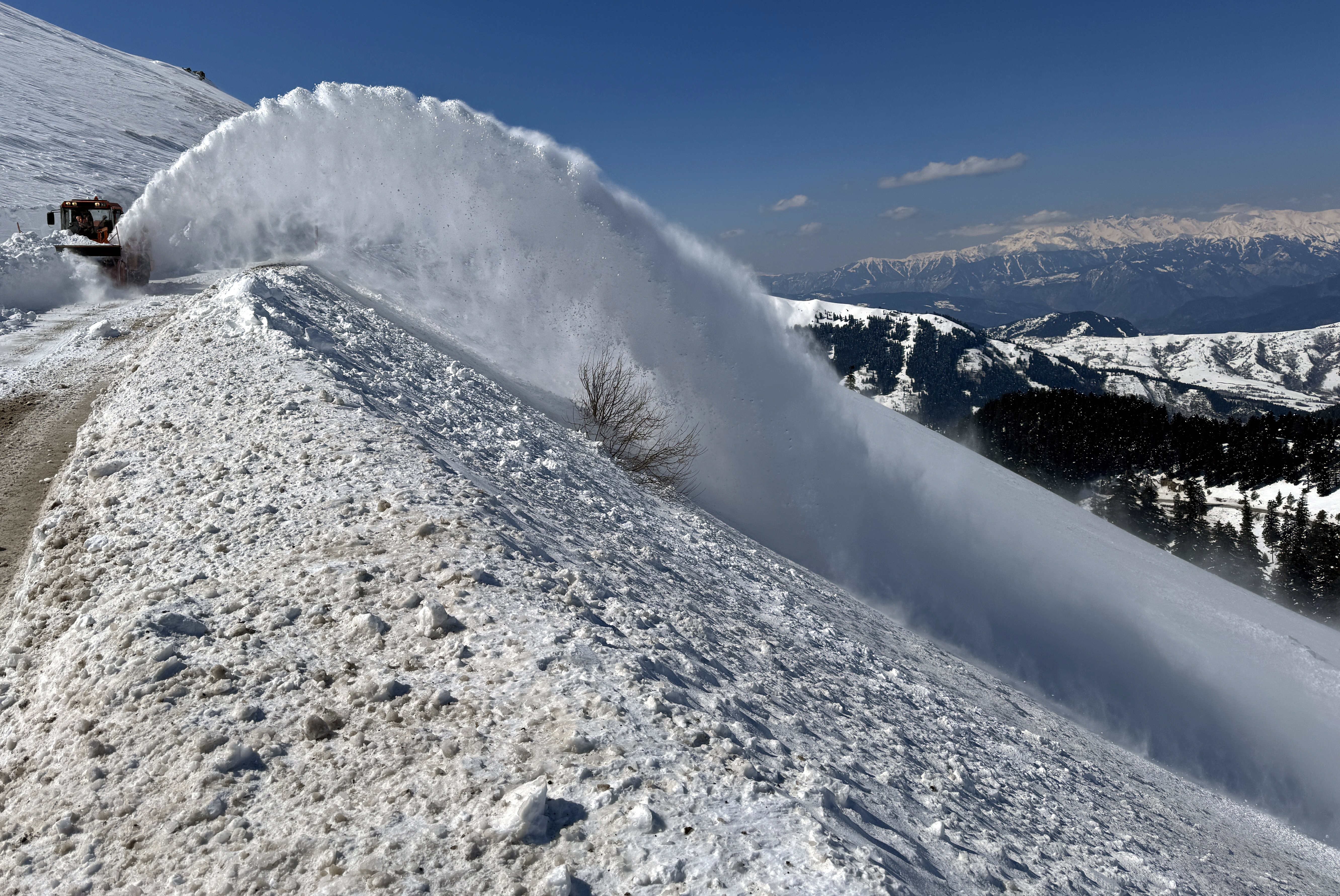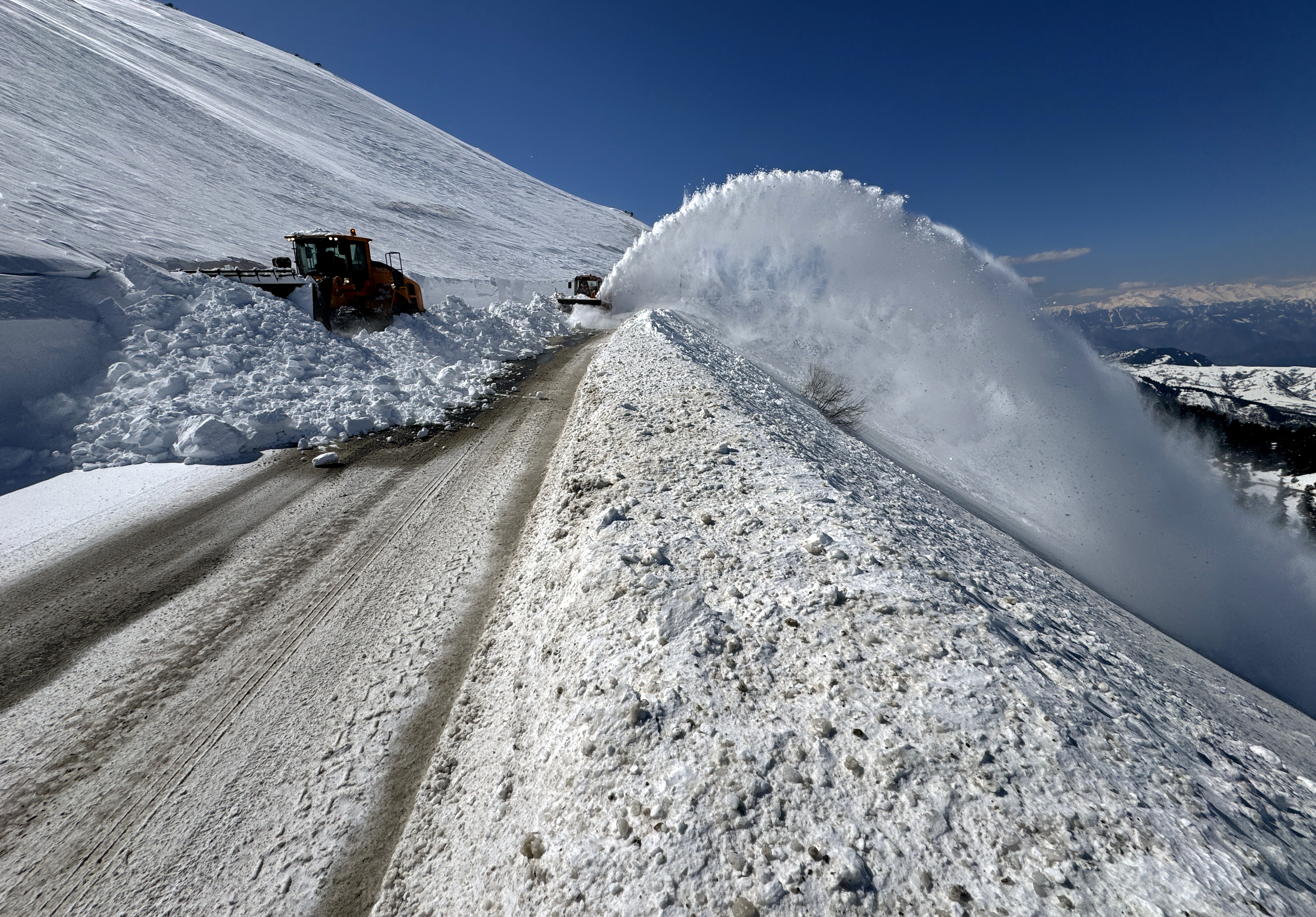 Bölgedeki yoğun kar kütleleri kepçe, greyder ve kar savurma makinesiyle temizleniyor.