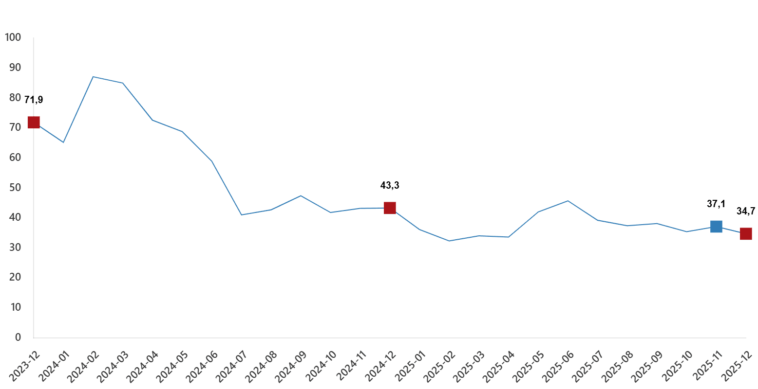Sanayi, inşaat, ticaret ve hizmet dalları toplamında ciro endeksi (2021=100), 2025 yılı Aralık ayında yıllık %34,7 arttı.