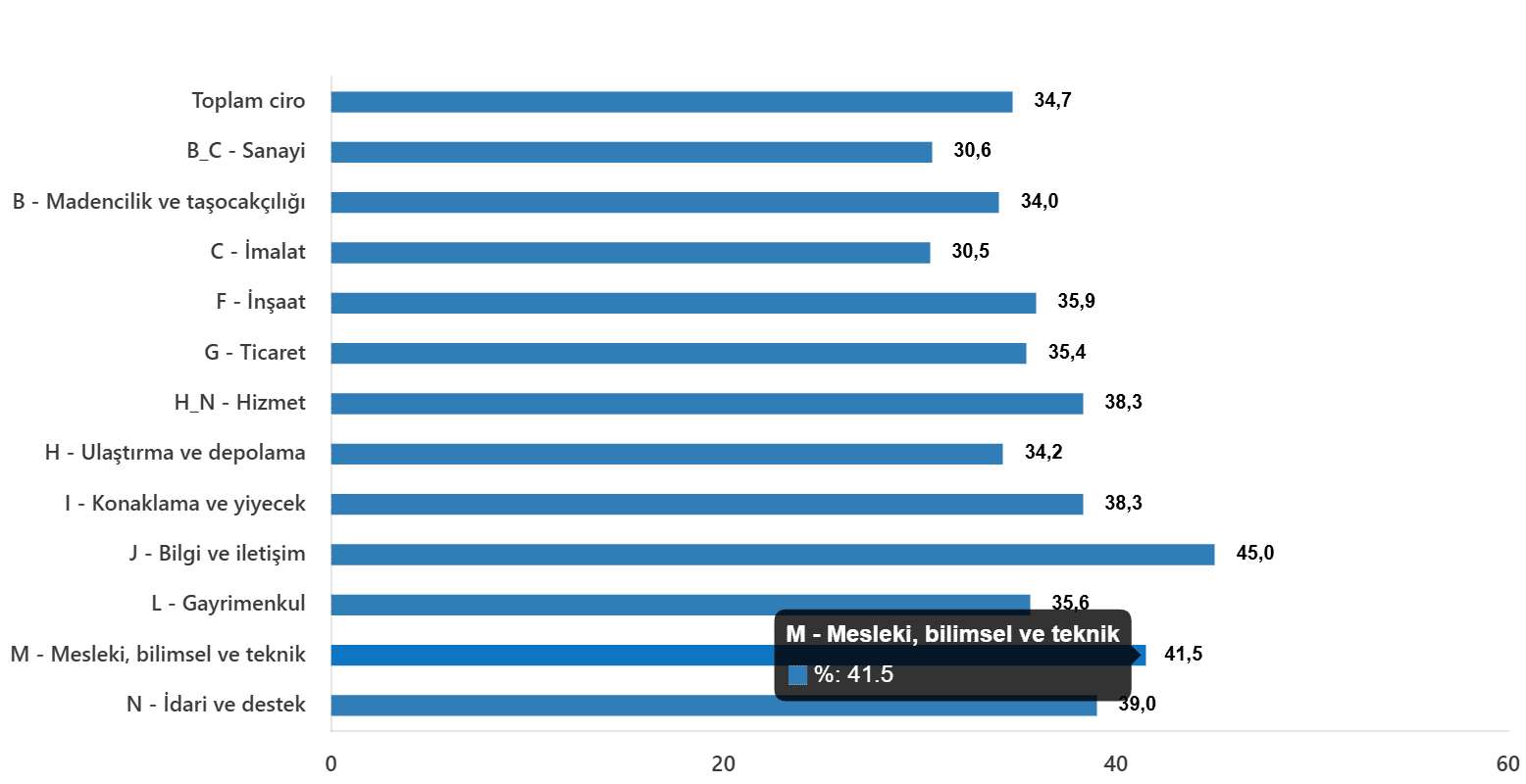 Toplam cironun alt ayrıntılarına bakıldığında; 2025 yılı Aralık ayında yıllık sanayi bölümü ciro endeksi %30,6 arttı, inşaat ciro endeksi %35,9 arttı, ticaret ciro endeksi %35,4 arttı, hizmet ciro endeksi %38,3 arttı.