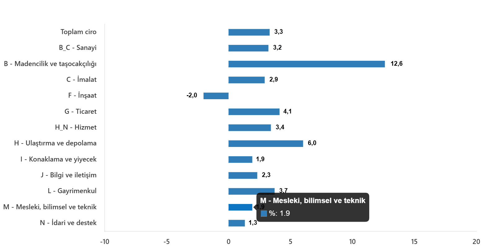 Toplam cironun alt ayrıntılarına bakıldığında; 2025 yılı Aralık ayında aylık sanayi kesimi ciro endeksi %3,2 arttı, inşaat ciro endeksi %2,0 azaldı, ticaret ciro endeksi %4,1 arttı, hizmet ciro endeksi %3,4 arttı.