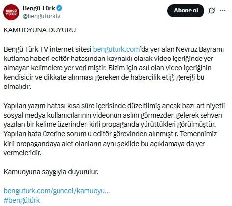 Bengü Türk TV internet sitesinde yer alan Nevruz Bayramı kutlama haberi editör hatasından kaynaklı olarak video içeriğinde yer almayan kelimelere yer verilmiştir. Bizim için asıl olan video içeriğinin kendisidir ve dikkate alınması gereken de habercilik etiği gereği bu olmalıdır.