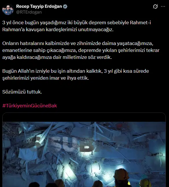 X hesabından bir paylaşım yapan Erdoğan, “Bugün Allah’ın izniyle bu işin altından kalktık, 3 yıl gibi kısa sürede şehirlerimizi yeniden imar ve ihya ettik. Sözümüzü tuttuk” ifadelerini kullandı.