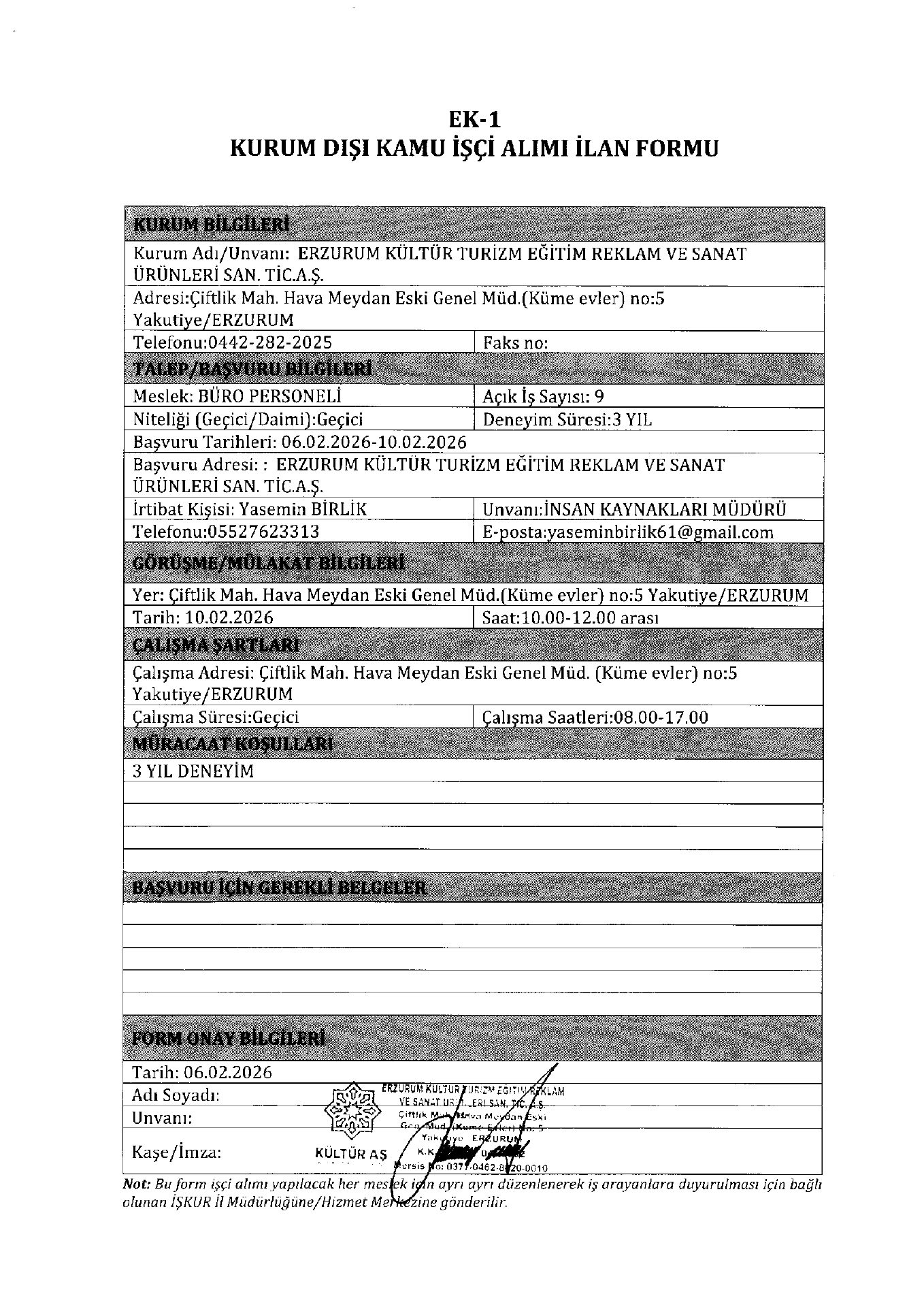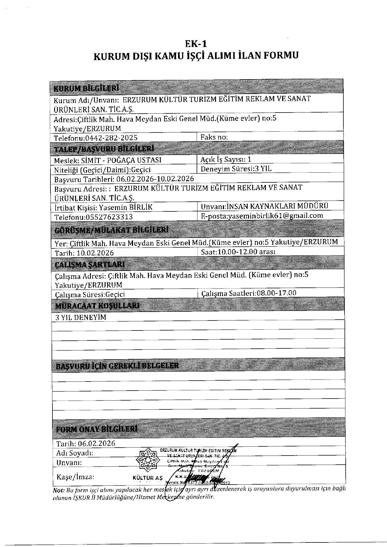 Erzurum Kültür Turizm Geçici 12 İşçi Alacak. Son başvuru tarihi 10 Şubat 2026