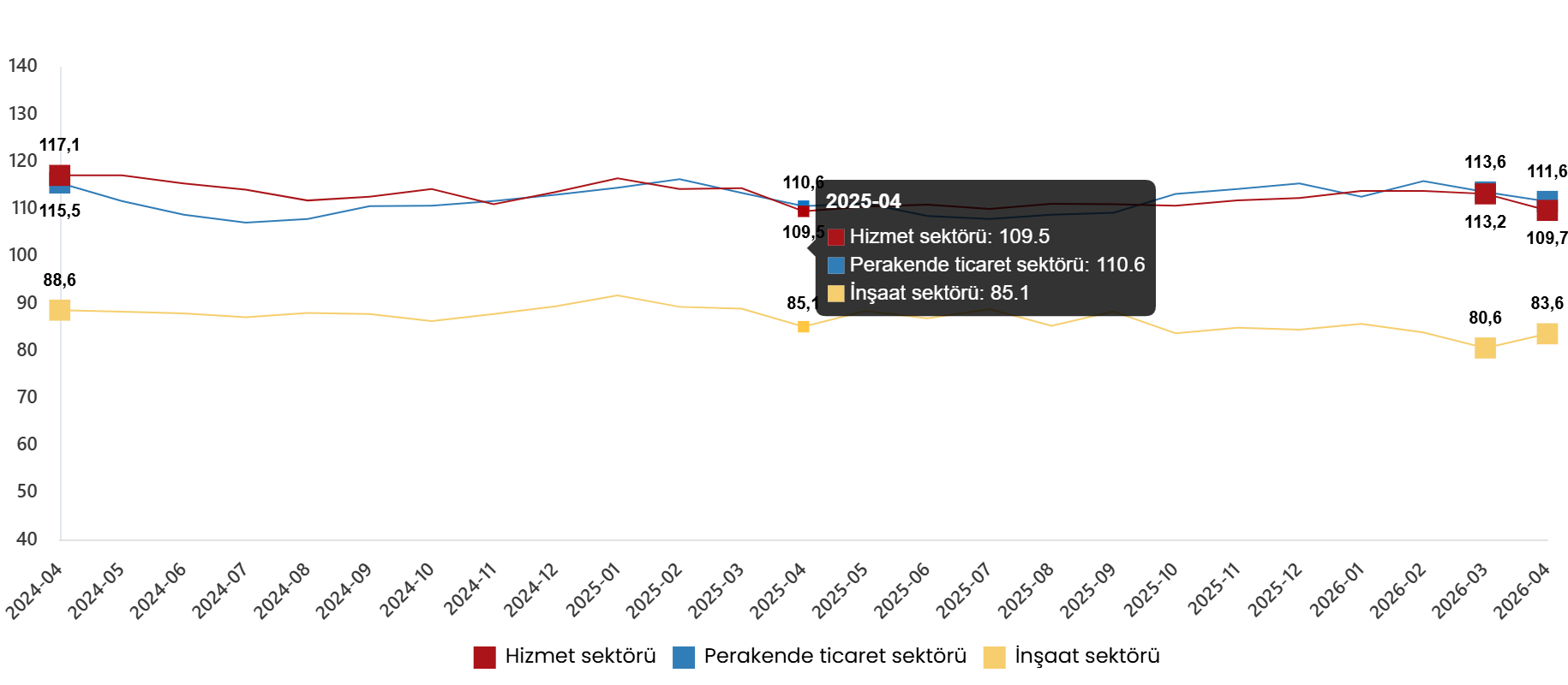 Mevsim tesirlerinden arındırılmış itimat endeksi Nisan ayında bir evvelki aya nazaran; hizmet dalında %3,1 oranında azalarak 109,7 pahasını, perakende ticaret kesiminde %1,8 oranında azalarak 111,6 kıymetini ve inşaat bölümünde %3,6 oranında artarak 83,6 kıymetini aldı.