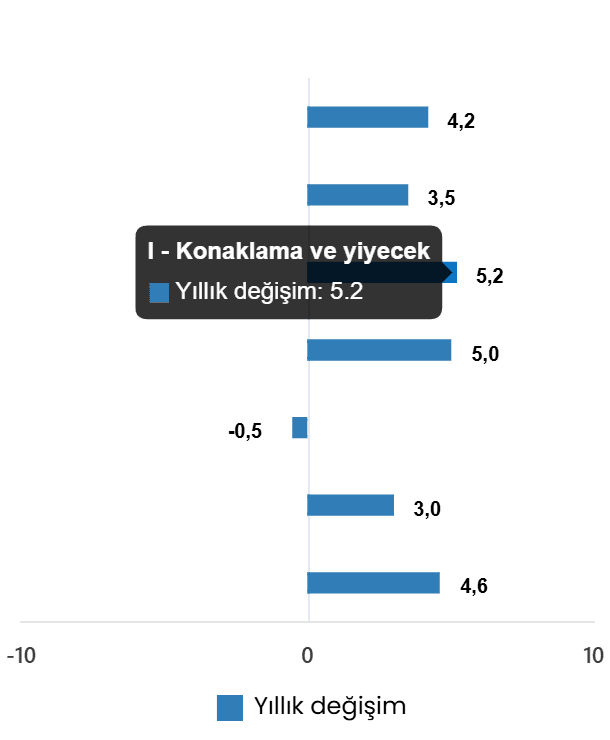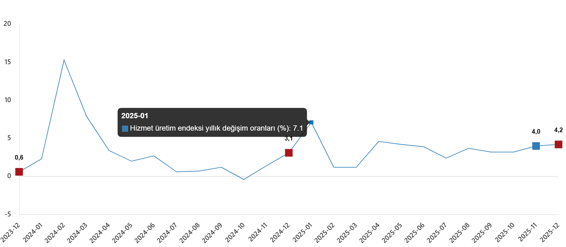 Hizmet üretim endeksi (2021=100) 2025 yılı Aralık ayında bir evvelki yılın birebir ayına nazaran %4,2 arttı. Birebir ayda ulaştırma ve depolama hizmetleri %3,5 arttı, konaklama ve yiyecek hizmetleri %5,2 arttı, bilgi ve bağlantı hizmetleri %5,0 arttı, gayrimenkul hizmetleri %0,5 azaldı, mesleksel, bilimsel ve teknik hizmetler %3,0 arttı, idari ve takviye hizmetleri ise %4,6 arttı.