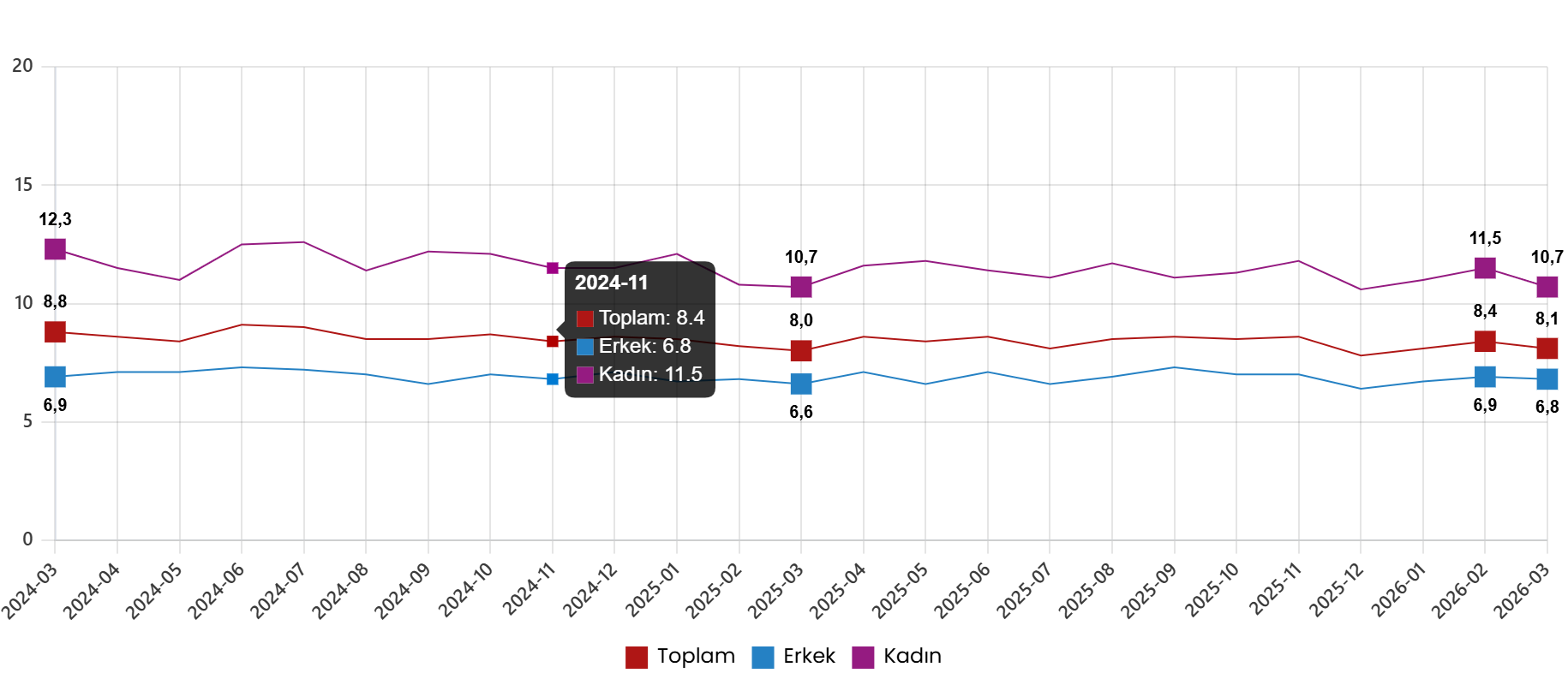 Mevsim tesirinden arındırılmış işsizlik oranı, Mart 2024 – Mart 2026