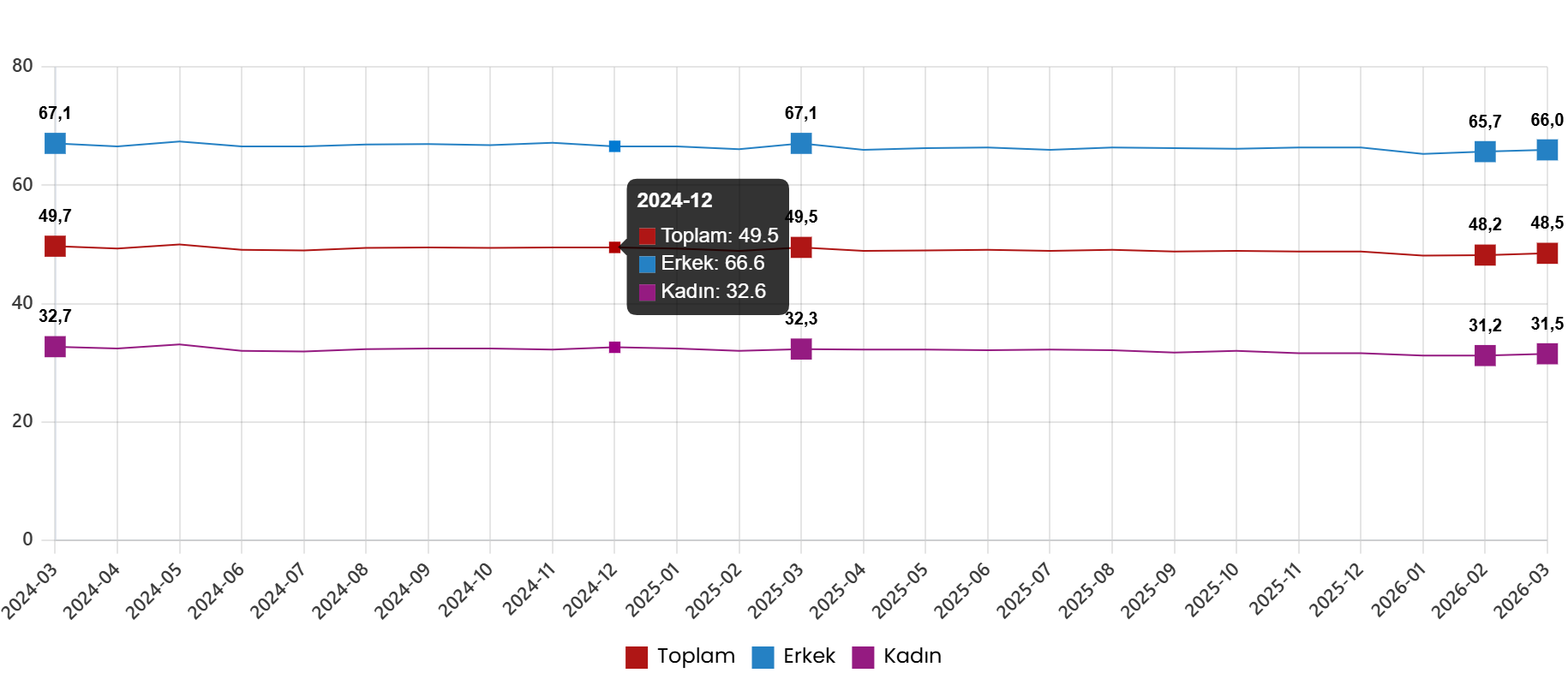 İstihdam edilenlerin sayısı 2026 yılı Mart ayında bir evvelki aya nazaran 226 bin kişi artarak 32 milyon 425 bin kişi, istihdam oranı ise 0,3 puan artarak %48,5 oldu. Bu oran erkeklerde %66,0 iken bayanlarda %31,5 olarak gerçekleşti.