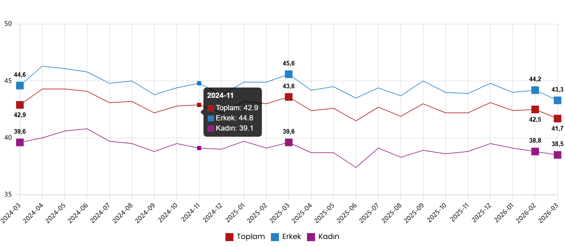 Mevsim ve takvim tesirlerinden arındırılmış haftalık ortalama fiili çalışma mühleti, Mart 2024 – Mart 2026