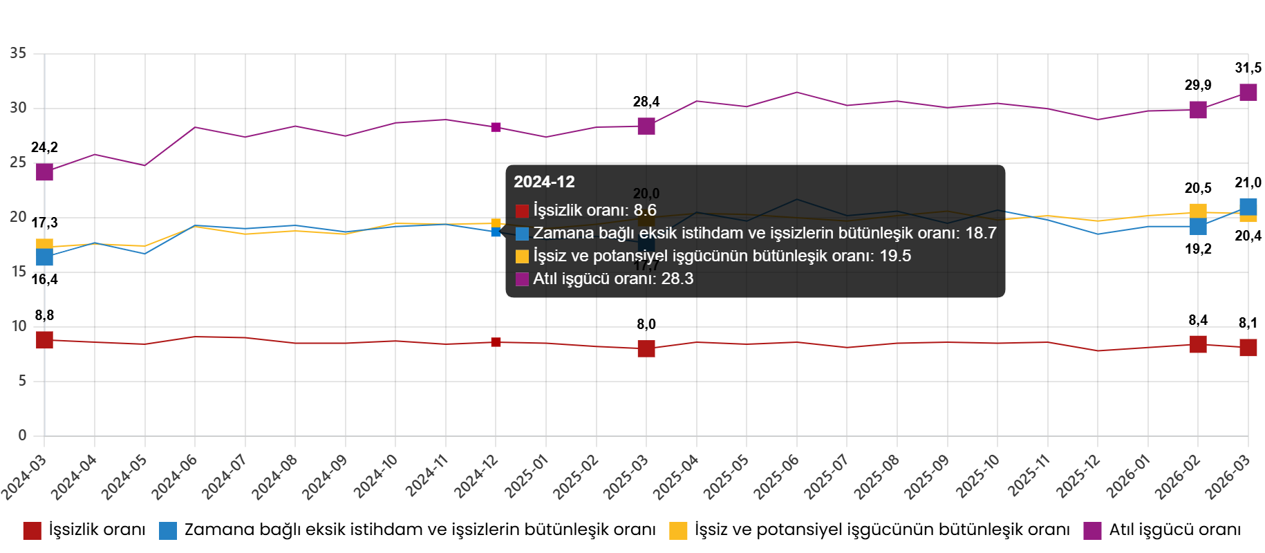 Zamana bağlı eksik istihdam, potansiyel işgücü ve işsizlerden oluşan atıl işgücü oranı 2026 yılı Mart ayında bir evvelki aya nazaran 1,6 puan artarak %31,5 oldu. Vakte bağlı eksik istihdam ve işsizlerin bütünleşik oranı %21,0 iken işsiz ve potansiyel işgücünün bütünleşik oranı %20,4 olarak kestirim edildi.