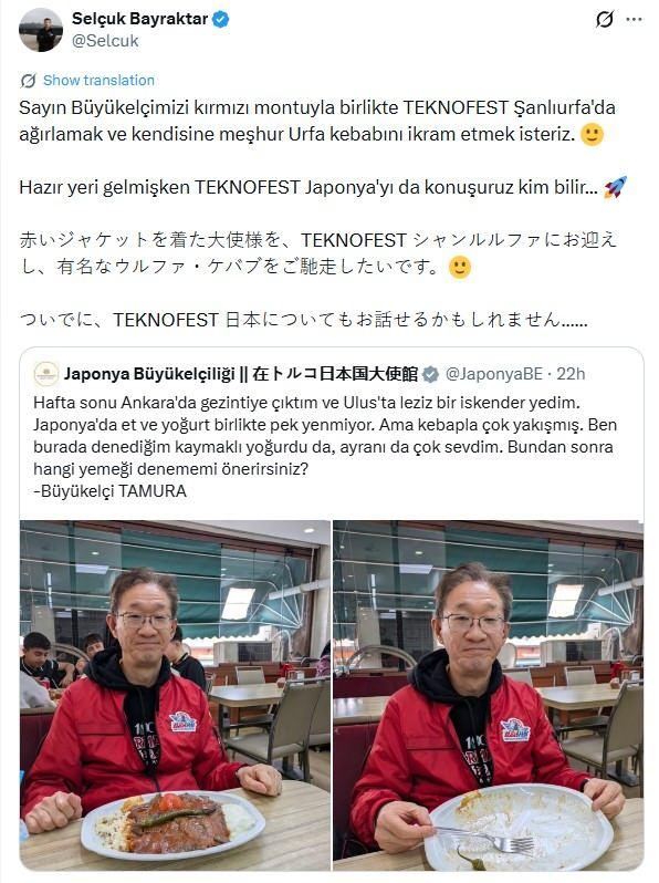 Japonya’nın Ankara Büyükelçisi Tamura Masami, Türk mutfağıyla ilgili paylaşımıyla yoğun ilgi gördü. Üzerinde kırmızı TEKNOFEST ceketi ile iskender’i çok beğendiğine dair paylaşım yapan Büyükelçi’ye Baykar Yönetim Kurulu Başkanı Selçuk Bayraktar’dan TEKNOFEST Şanlıurfa davetli yanıt geldi.