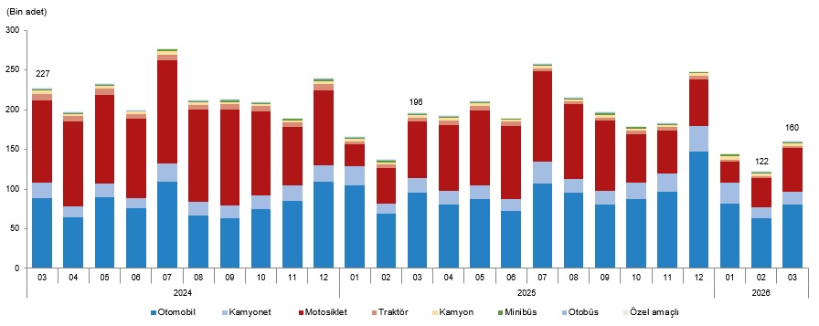 Mart ayında 159 bin 931 adet taşıtın trafiğe kaydı yapıldı