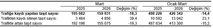 Trafiğe kaydı yapılan ve trafikten kaydı silinen motorlu kara taşıtları, Mart 2026