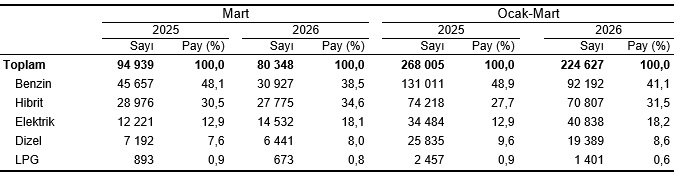 Ocak-Mart periyodunda trafiğe kaydı yapılan 224 bin 627 adet arabanın %41,1’i akaryakıt, %31,5’i hibrit, %18,2’si elektrikli, %8,6’sı dizel ve %0,6’sı LPG yakıtlıdır. Mart ayı sonu prestijiyle trafiğe kayıtlı 17 milyon 611 bin 509 adet arabanın ise %32,4’ü dizel, %31,0’ı akaryakıt, %29,8’i LPG, %4,4’ü hibrit ve %2,3’ü elektriklidir. Yakıt tipi bilinmeyen(3) otomobillerin oranı ise %0,2’dir.