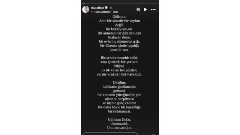Ünlü şarkıcı Murat Boz, sosyal medya hesabından yaptığı paylaşımla Doku ailesinin adalet arayışına ses verdi.