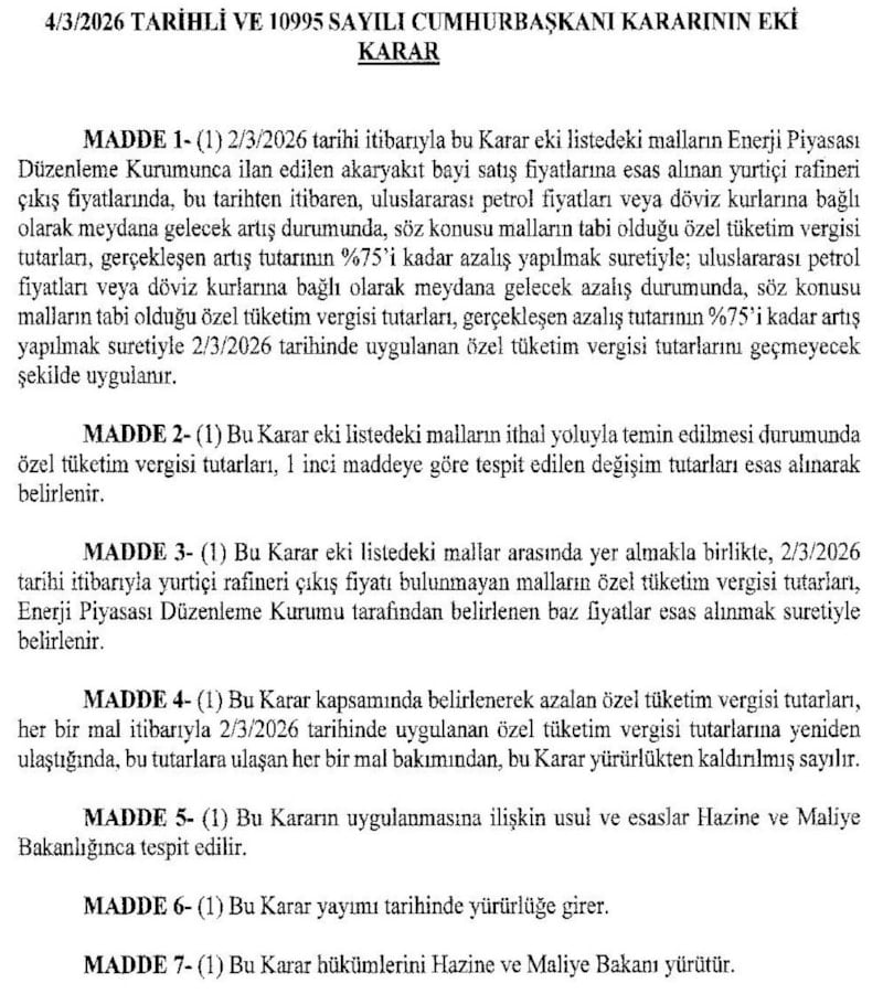 Karara göre uluslararası petrol fiyatları veya döviz kurlarına bağlı olarak akaryakıt fiyatlarına gelecek artışta ÖTV tutarları artışın yüzde 75’i kadar azalarak uygulanacak.