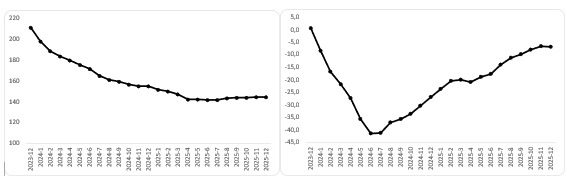 Şekil 1: Ortalama araba gerçek fiyatı (2020 Ocak=100) (Sol panel), ortalama araba gerçek fiyatının yıllık değişimi (%) (Sağ panel)