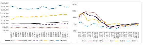 Şekil 4: Yakıt çeşidine nazaran ortalama araba fiyatı (TL) (Sol panel), yakıt çeşidine nazaran ortalama araba fiyatının yıllık değişimi (%) (Sağ panel)