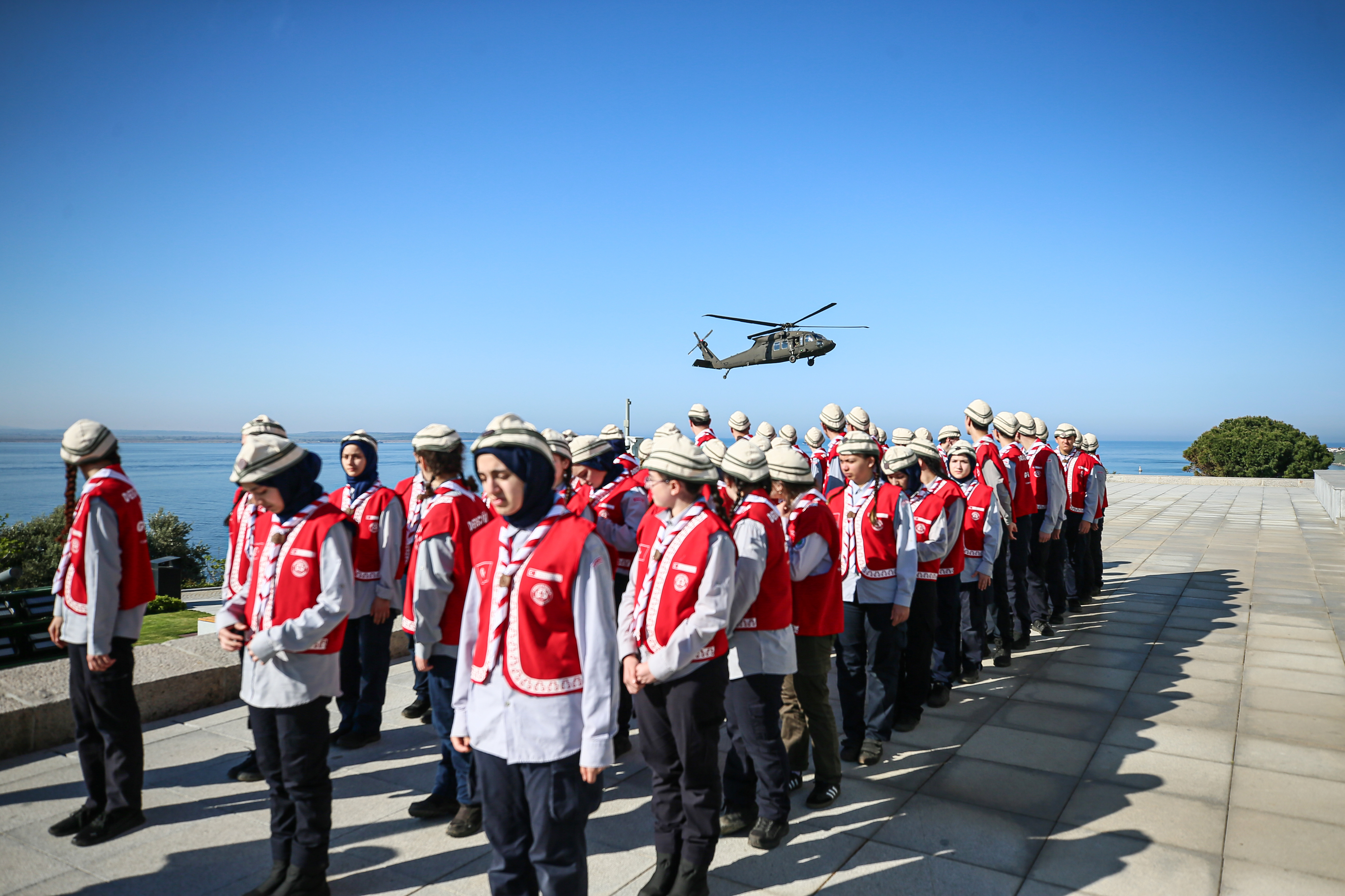 Protokol üyeleri daha sonra Şehitler Abidesi'nin deniz tarafında kurulan alana geçerek Türk Hava Kuvvetlerinin gösteri ekibi Türk Yıldızları'nın Çanakkale Boğazı üzerindeki gösterisini izledi.