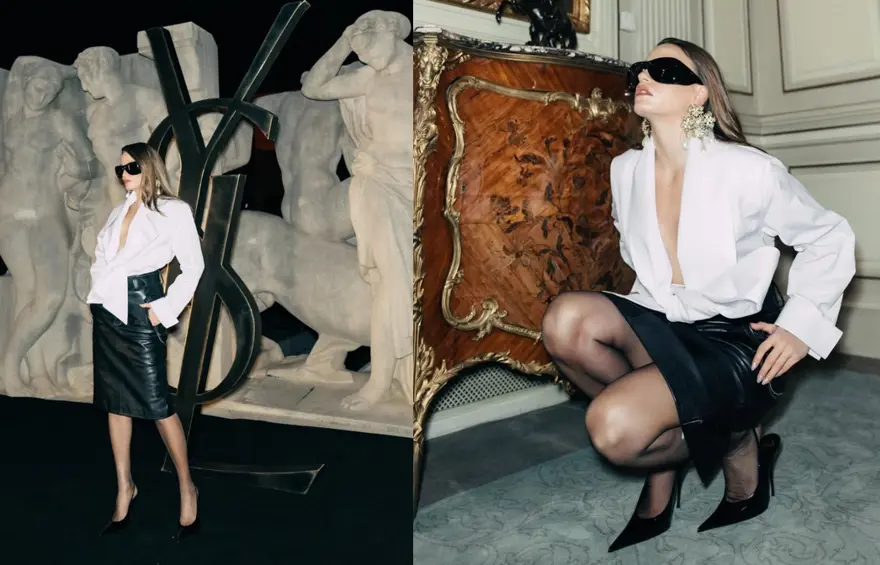 Yves Saint Laurent defilesine konuk olan Sarıkaya, yüksek bel siyah deri etek, tasarım beyaz bir gömlek giymeyi tercih etti. Ünlü isim, kombinini siyah yüksek topuklu ayakkabılar ve inci detaylı büyük altın rengi küpeler ve siyah gözlükle tamamladı.
