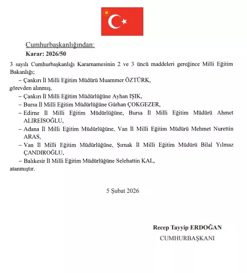 Milli Eğitim Bakanlığı; Çankırı İl Milli Eğitim Müdürü Muammer Öztürk görevden alındı. Çankırı İl Milli Eğitim Müdürlüğüne Ayhan Işık, Bursa İl Milli Eğitim Müdürlüğüne Gürhan Çokgezer, Edirne İl Milli Eğitim Müdürlüğüne, Bursa İl Milli Eğitim Müdürü Ahmet Aliresioğlu, Adana İl Milli Eğitim Müdürlüğüne, Van İl Milli Eğitim Müdürü Mehmet Nurettin Aras, Van İl Milli Eğitim Müdürlüğüne, Şırnak İl Milli Eğitim Müdürü Bilal Yılmaz Çandıroğlu, Balıkesir İl Milli Eğitim Müdürlüğüne Selehattin Kal atandı.