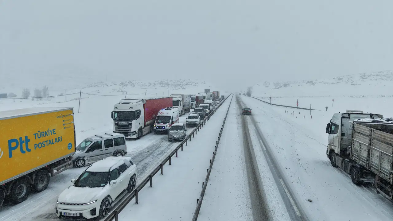 Bölgede bekleyen araçlar havadan görüntülendi. Karayolları ekipleri yolların yeniden ulaşıma açılması için çalışmalarını sürdürüyor.