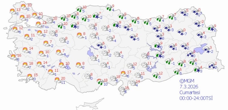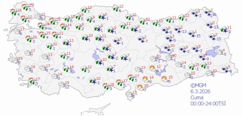 Meteoroloji Genel Müdürlüğü’nün (MGM) son verilerine göre ülke genelinde parçalı bulutluluk, yağmur, karla karışık yağmur ve yer yer kar yağışları bekleniyor.