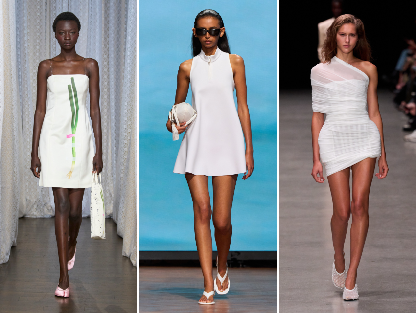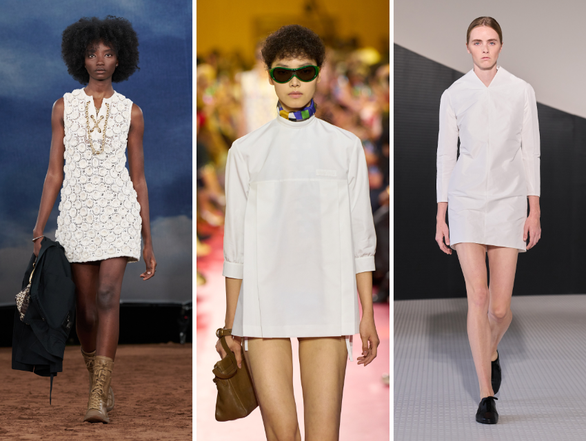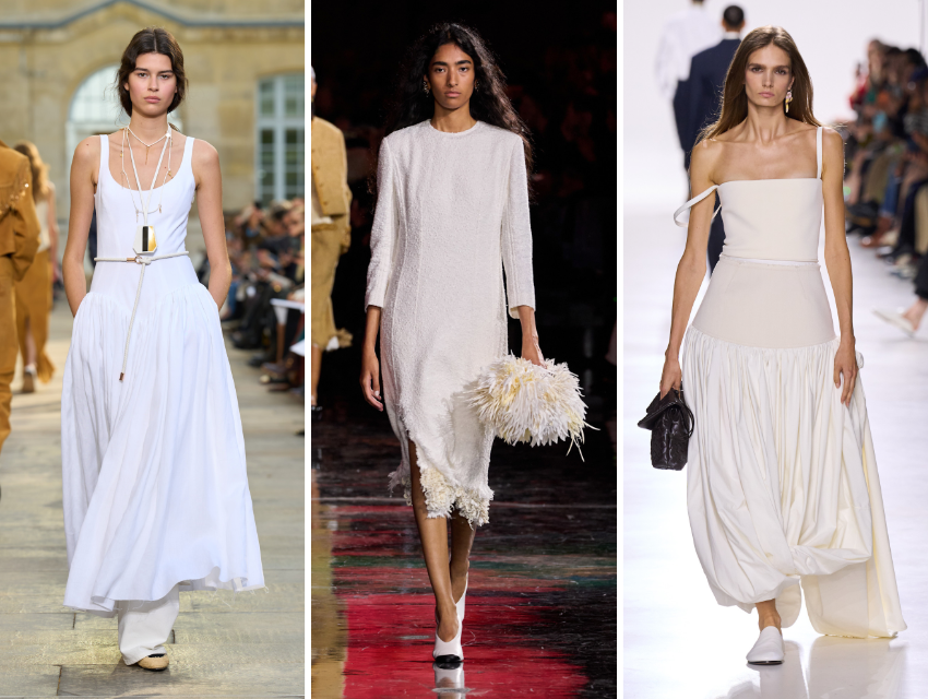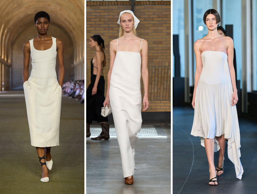 Küçük beyaz elbiseler bu sezon özellikle dikkat çekiyor. Burberry ve Jil Sander, keten mini elbiseleri ve pamuk poplin maksi modelleri oldukça sade bir şekilde stilize ediyor: düz sandaletler, hafif eşarplar ve abartısız aksesuarlarla.