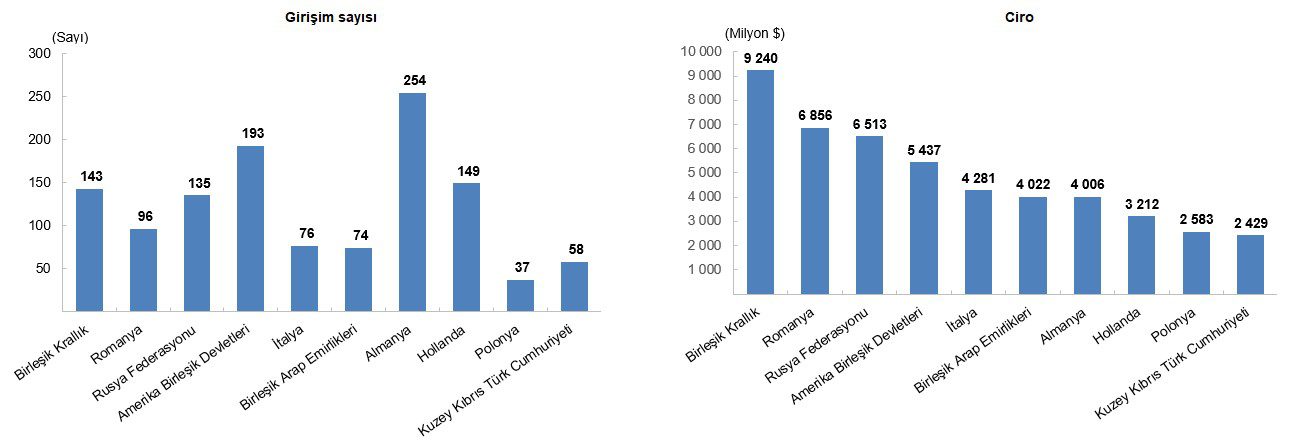 Romanya, yurt dışında denetim edilen teşebbüs sayısı açısından 96, elde edilen ciro açısından da 6 milyar 856 milyon dolar ile ikinci sırada yer aldı. Ciroda 6 milyar 513 milyon dolar ile üçüncü sırayı alan Rusya Federasyonu’nda denetim edilen teşebbüs sayısı 135 olarak gerçekleşti.